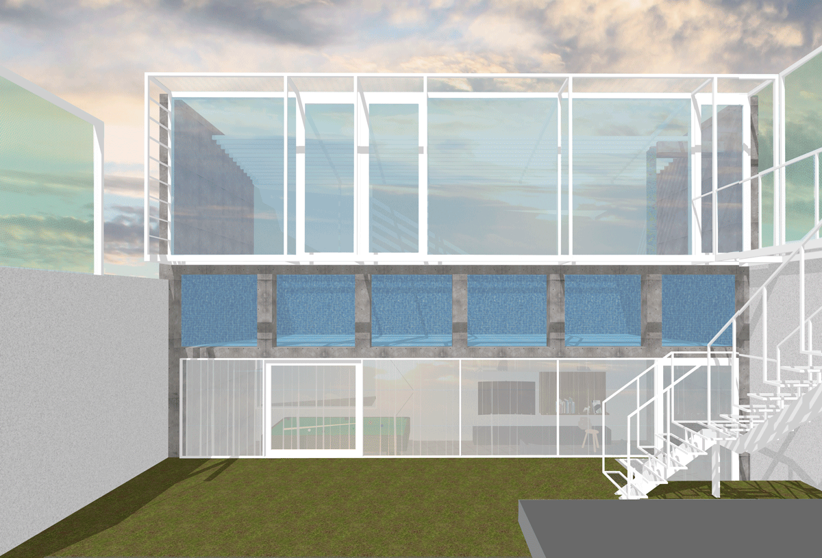 La estructura principal se alinea a la geometría del predio, retirándose del límite posterior para incorporar, en ese vacío, un depósito y un baño en la planta baja, un entrepiso técnico, y una terraza cubierta en el mismo nivel de la piscina, a la que se incorpora un baño y vestidor. La piscina se configura y protege a partir una estructura metálica que, mediante su doble orden alternado, adquiere un nivel corpóreo que también es liviano y transparente. Esta condición se ve reforzada por una doble envolvente vertical que incorpora una pasarela en su desarrollo: permitiendo el mantenimiento y limpieza constante de los vidrios, la colocación de macetas, y la construcción de un filtro solar más denso, variable y natural.